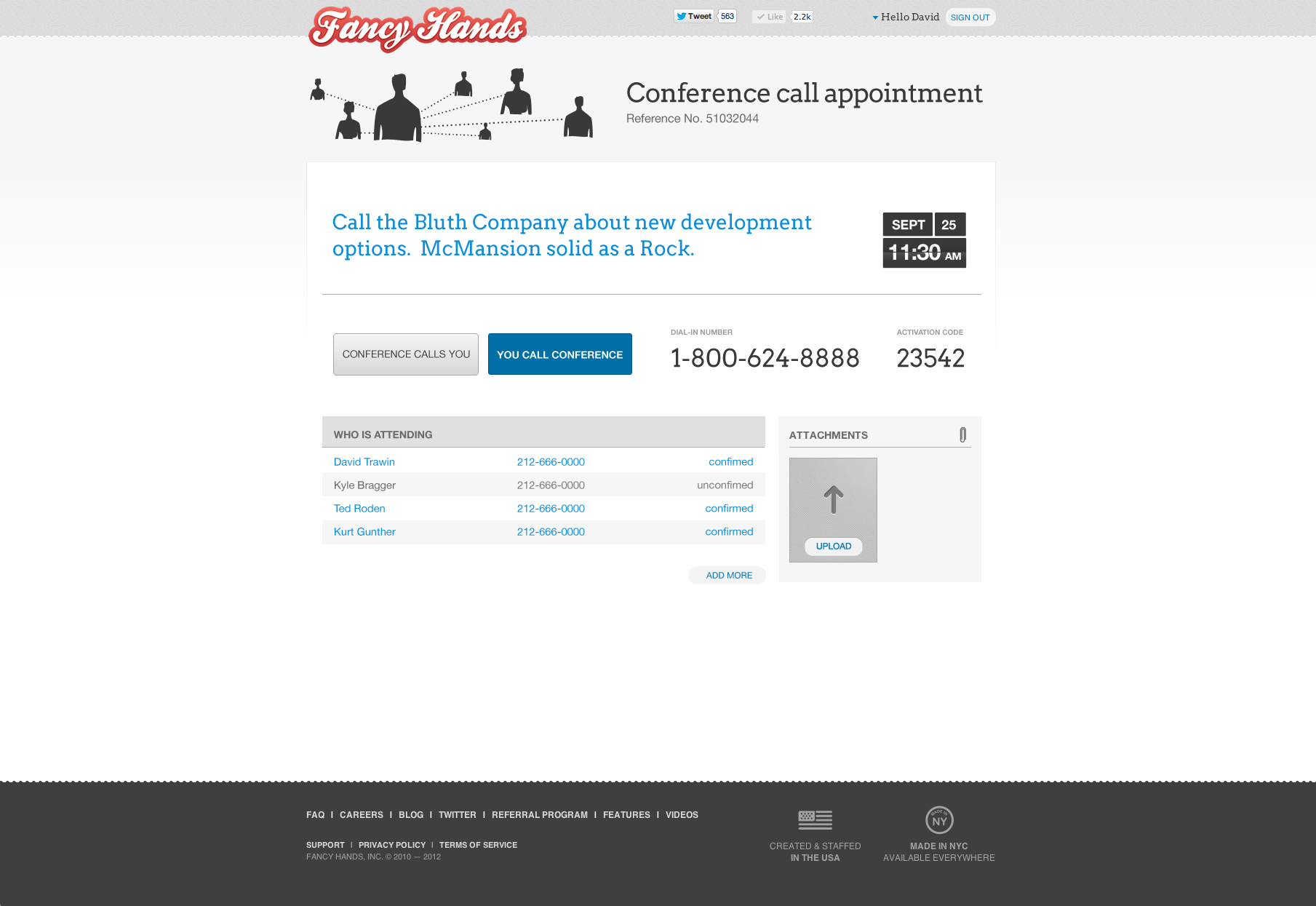 The conference call attendees will receive an email from Fancy Hands on your behalf before the call with all of the details, including the call-in number, the date, and the time.